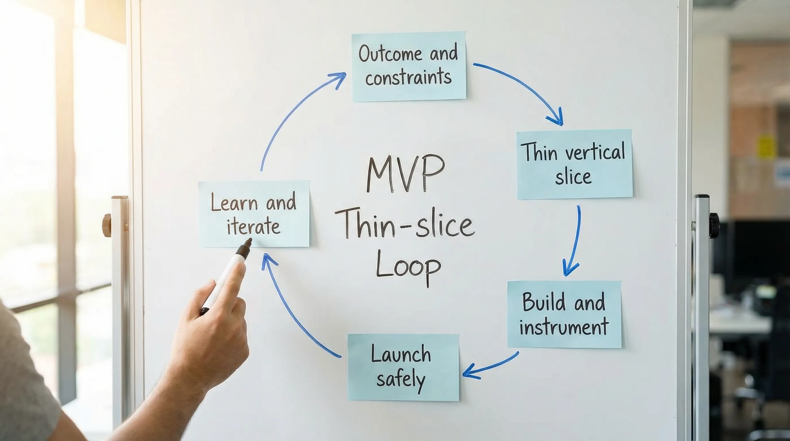 How do you scope an MVP for a faster launch? Scope one end-to-end workflow (a thin vertical slice), define explicit exclusions, and defer secondary features and integrations until after you validate the outcome metric.