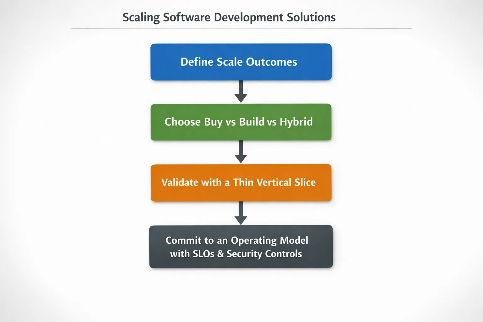 What are “software development solutions” in the context of scaling? Software development solutions can include custom development, SaaS tools, industry platforms, and hybrid approaches (buying commodity capabilities while building differentiated product logic). For scale, the best solution is the one that supports growth in users, features, and teams without exploding operational and maintenance costs.
