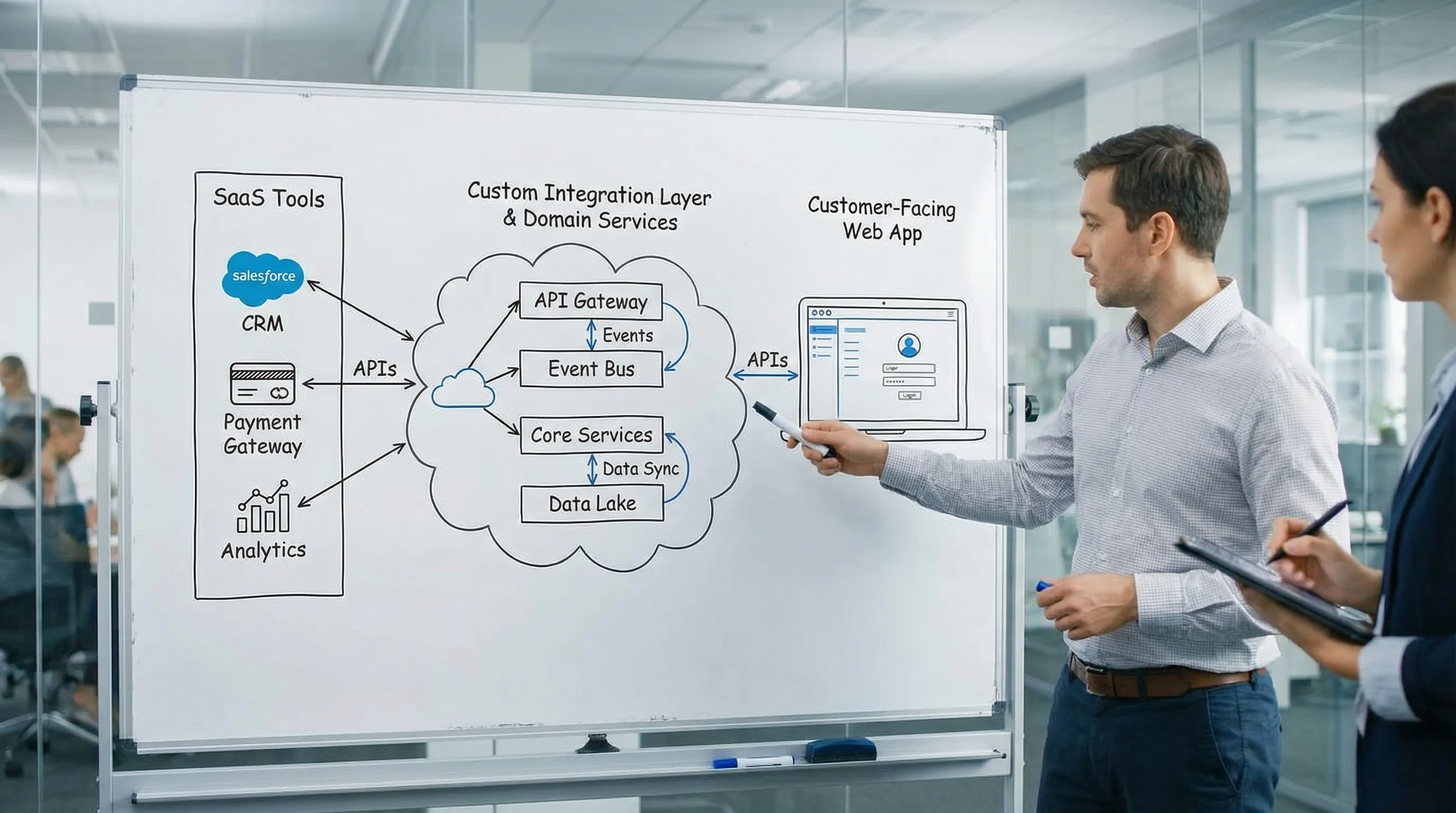 | Buy core, build differentiators | System of record (CRM, ERP, CMS) | Custom UX, rules, workflows | When your advantage is experience or logic | Vendor API limits, version drift |