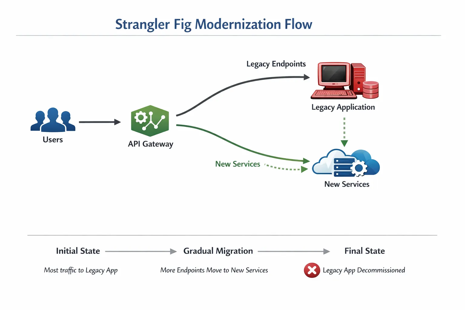 | Strangler façade + incremental replacement | Route selected endpoints to new services and expand over time | Very low | Customer facing flows and APIs | Requires solid routing and observability |