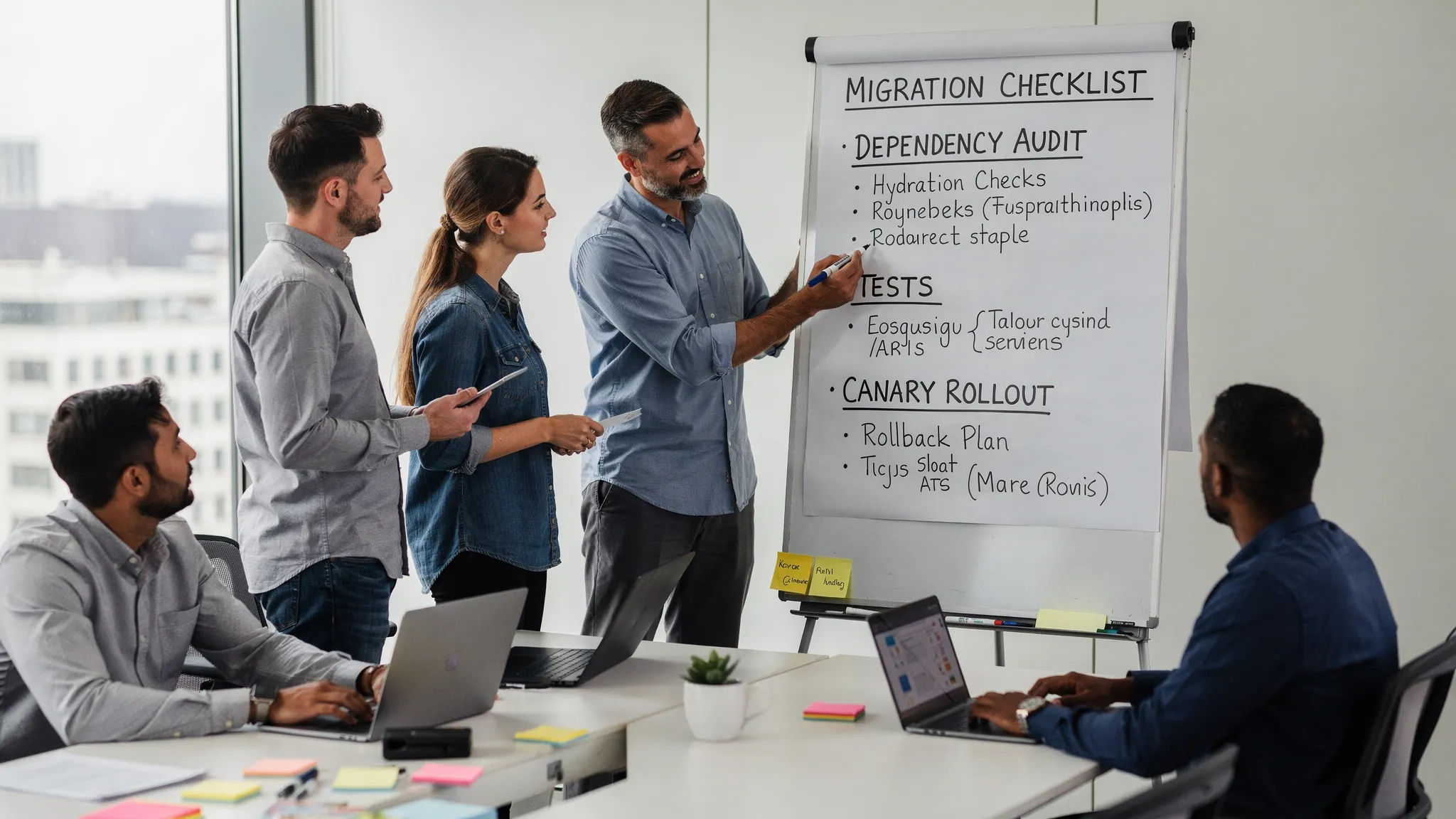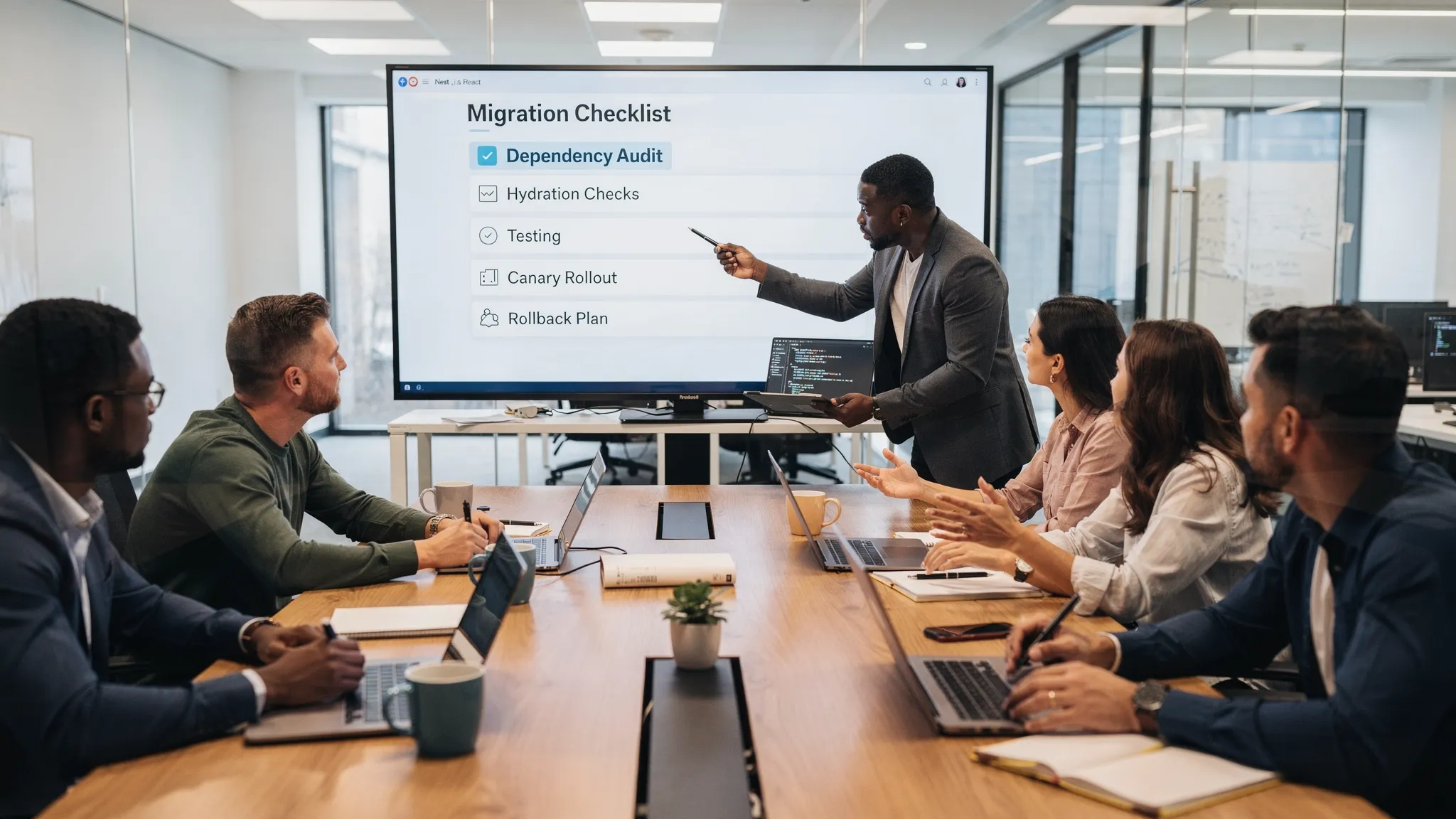 How do I reduce risk if my app has lots of third-party UI libraries? Do a dependency audit first, upgrade and validate the most complex routes in a thin vertical slice, and add end-to-end coverage before deep refactors.