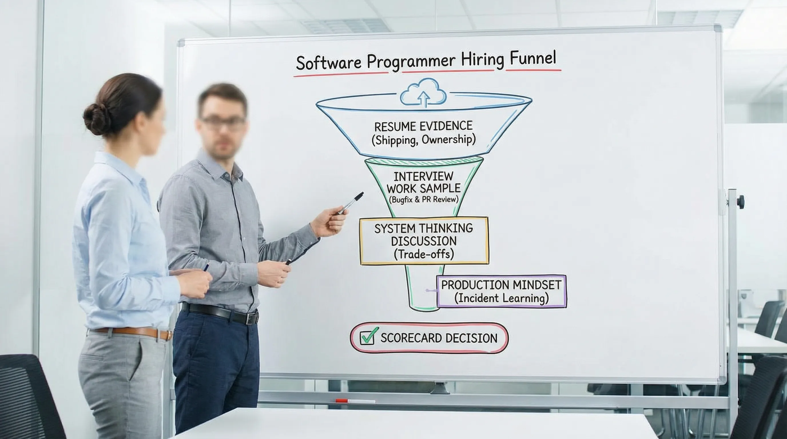 Should we use take-home coding tests? Take-homes can work if they are small (1 to 2 hours), realistic, and assessed with clear criteria. Many teams get better signal from a collaborative work sample (bugfix or PR review) that mirrors the job.