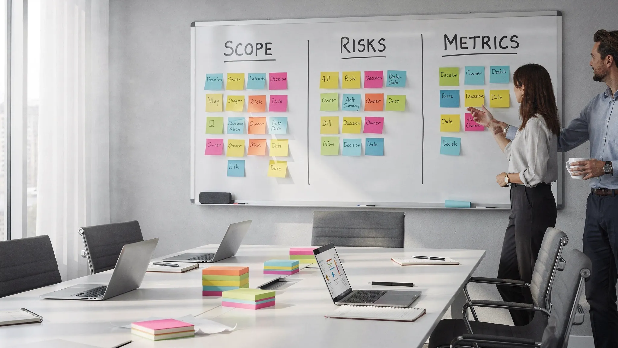 | Delivery risk | Part-time SMEs, unclear decision rights | Assign DRIs, set a weekly decision forum, define escalation paths |