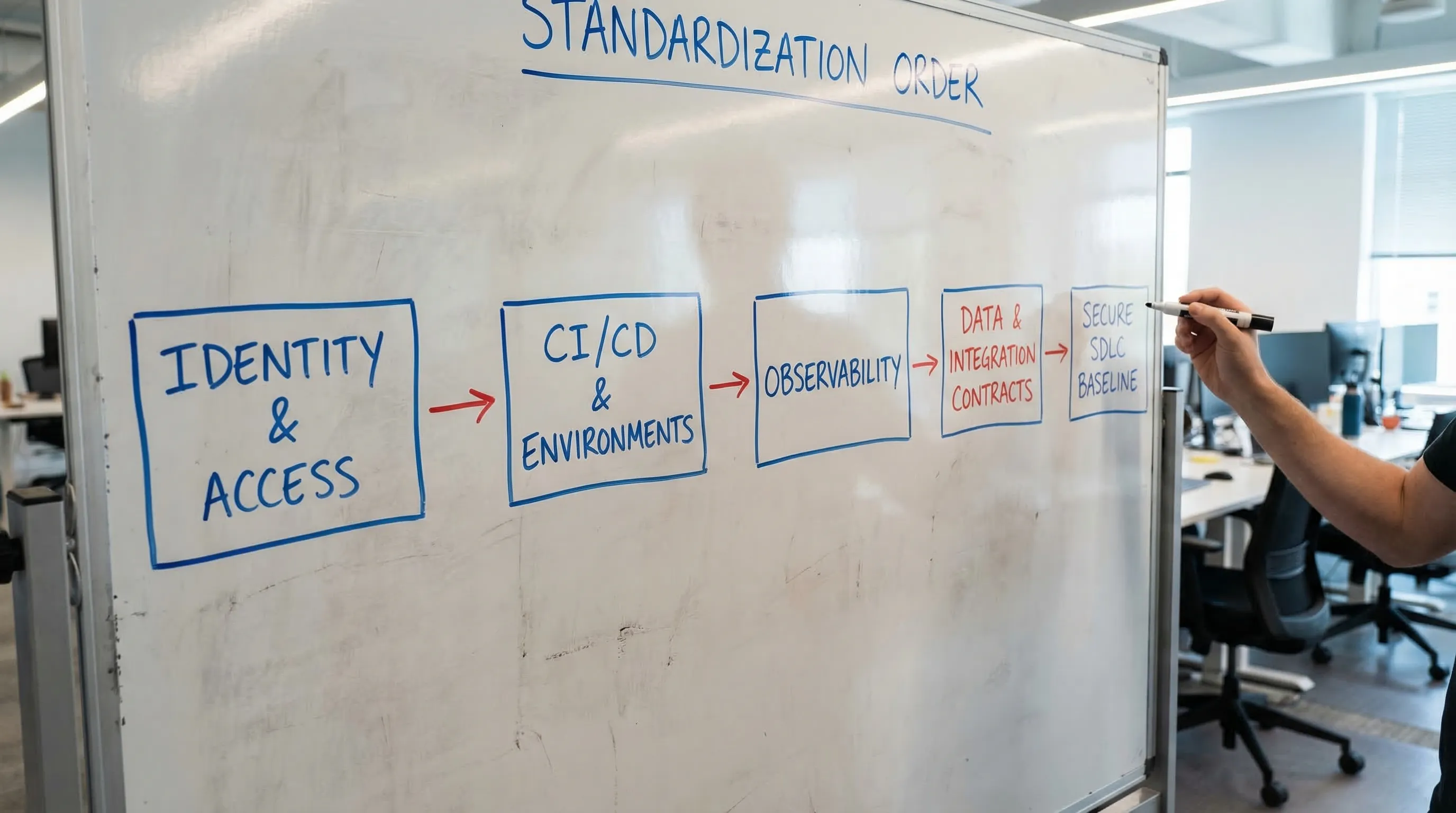 Standardization is not “one tool for everything.” It is making key decisions repeatable so teams can deliver safely without re-litigating fundamentals every sprint.