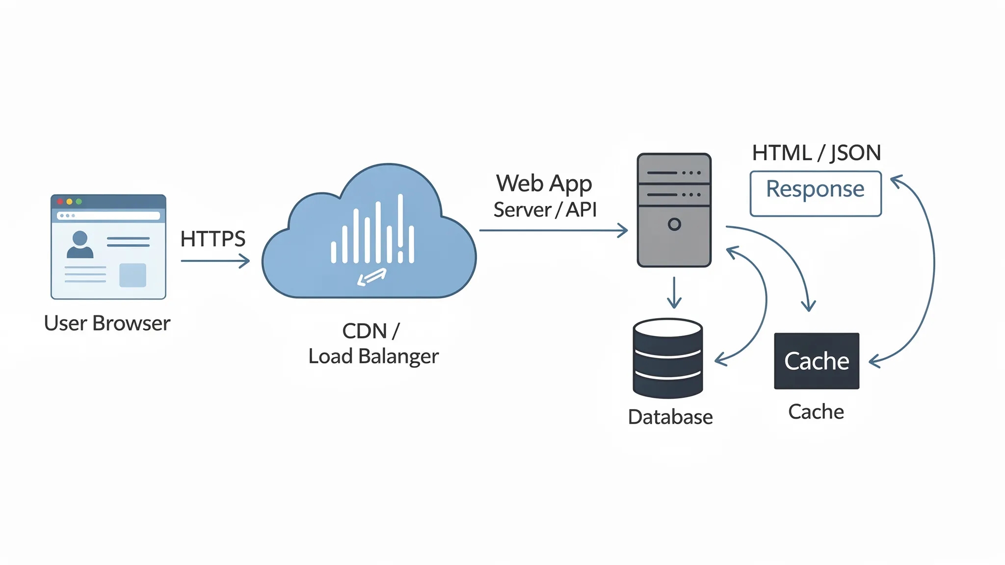 How does a web application work step by step? Typically: your browser resolves the domain (DNS), opens a secure HTTPS connection (TLS), sends an HTTP request to the app, the server runs business logic and talks to data stores, then returns HTML or JSON that the browser renders and makes interactive.